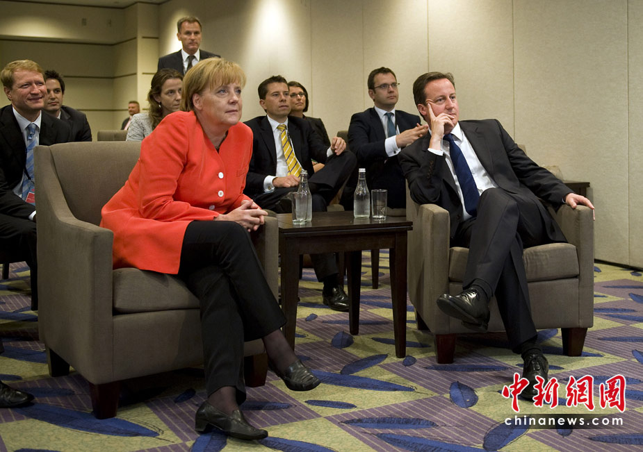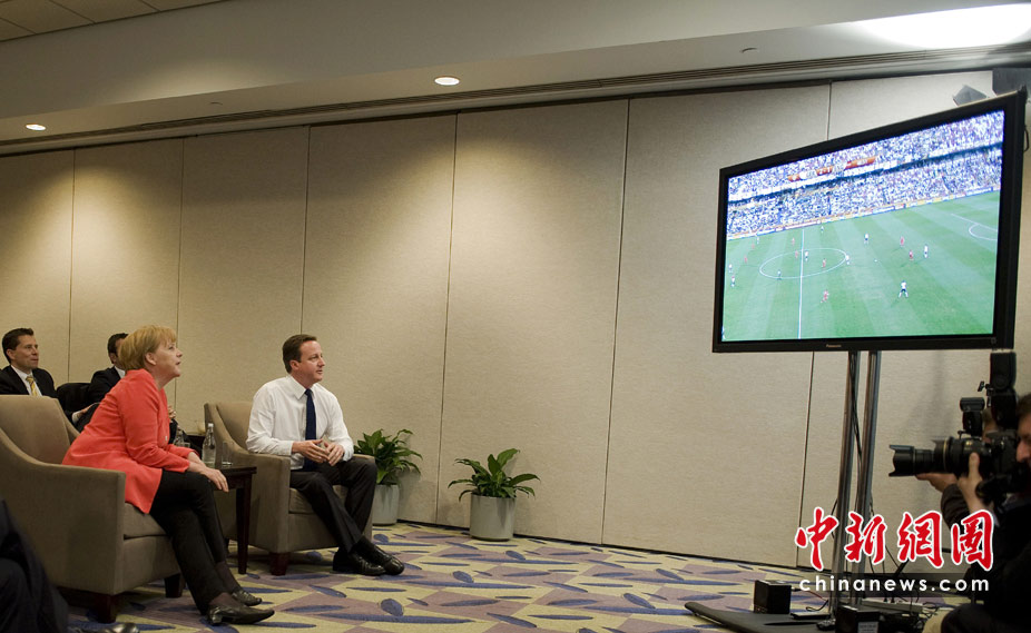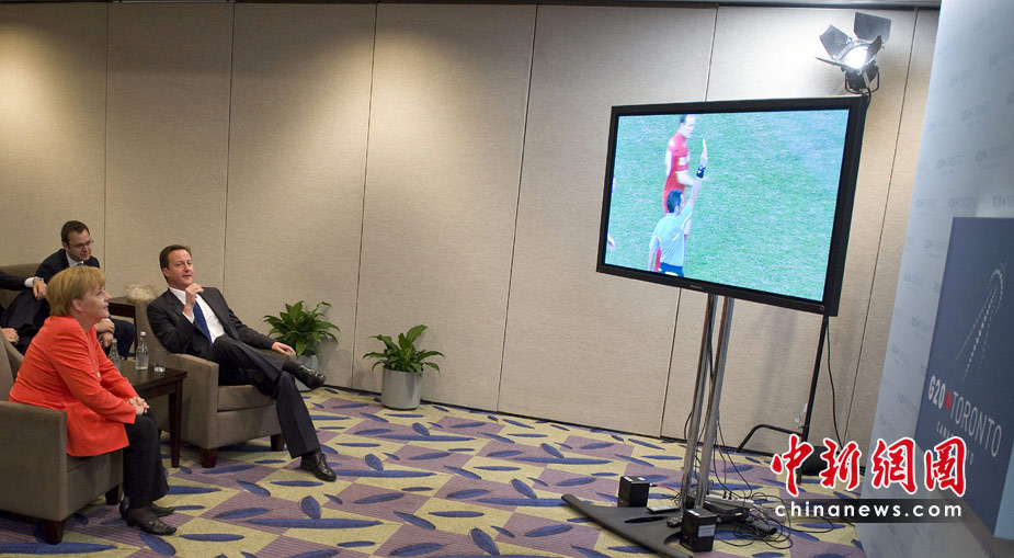 6月27日,正在加拿大參加G20領(lǐng)導(dǎo)人峰會的德國總理默克爾和英國首相卡梅倫,一同觀看了世界杯英格蘭與德國隊的比賽。