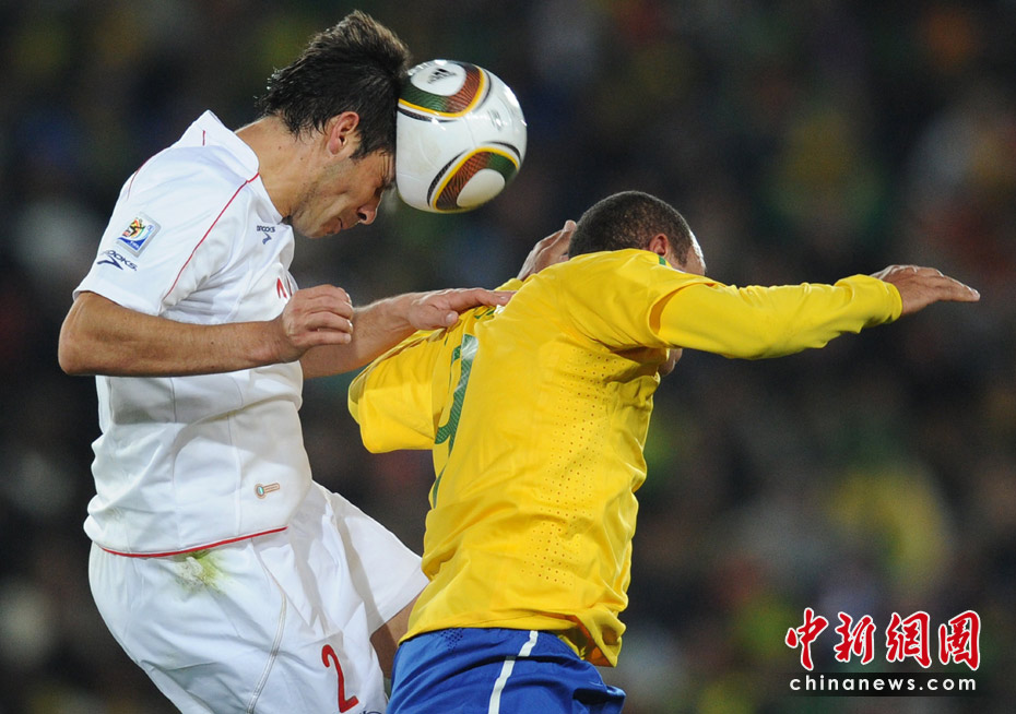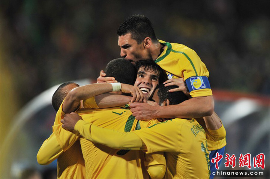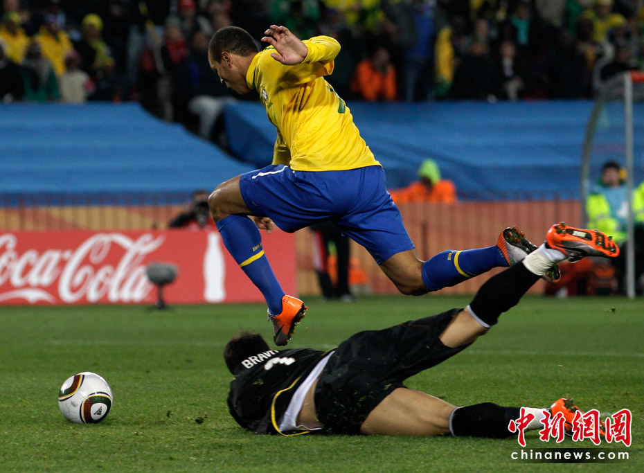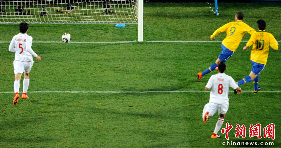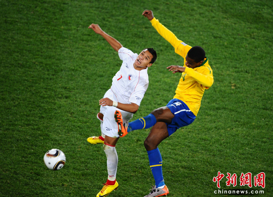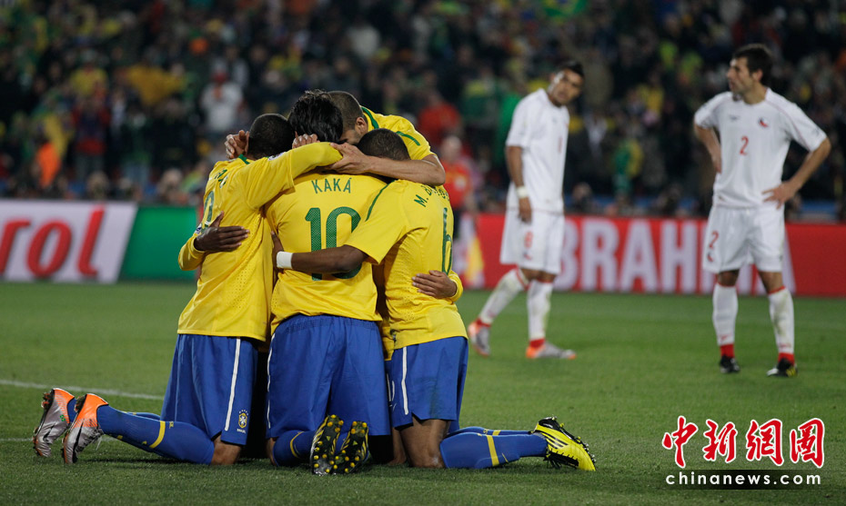 6月29日凌晨2:30,南非世界杯1/8決賽再戰(zhàn)一場(chǎng)。奪冠熱門(mén)巴西隊(duì)在約翰內(nèi)斯埃利斯公園球場(chǎng)迎來(lái)了南美兄弟智利隊(duì)。最終憑借胡安和法比亞諾的在上半場(chǎng)的進(jìn)球、羅比尼奧下半場(chǎng)錦上添花,巴西隊(duì)以3-0淘汰智利,晉級(jí)八強(qiáng)。