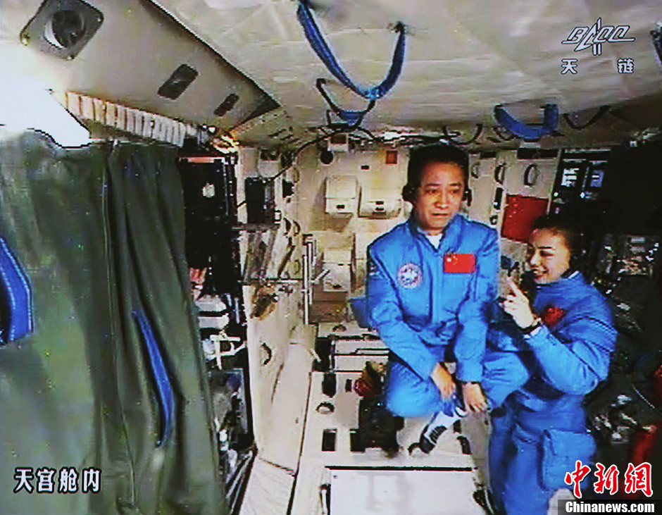 6月20日10時許,神舟十號航天員在天宮一號開展基礎(chǔ)物理實驗,為青少年進行中國首次太空授課。圖為講授失重狀態(tài),聶海勝表演“懸空打坐”。中新社發(fā) 秦憲安 攝