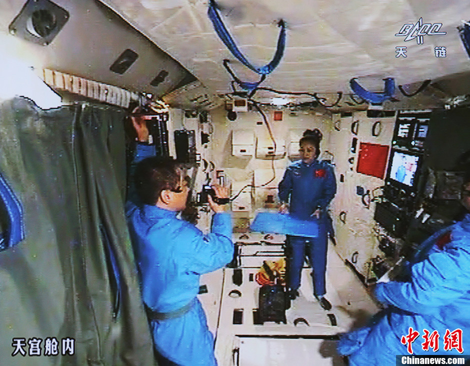 6月20日10時許,神舟十號航天員在天宮一號開展基礎(chǔ)物理實驗,為青少年進(jìn)行中國首次太空授課。圖為實時畫面。中新社發(fā) 秦憲安 攝