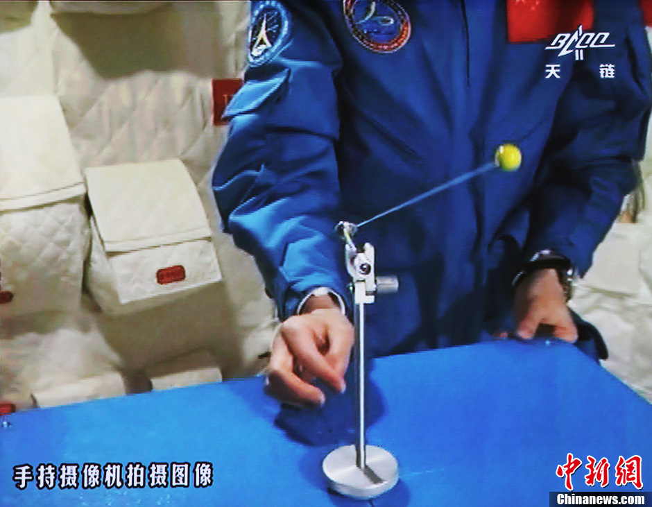 6月20日10時(shí)許,神舟十號航天員在天宮一號開展基礎(chǔ)物理實(shí)驗(yàn),為青少年進(jìn)行中國首次太空授課。圖為王亞平講授太空失重提供條件下的單擺演示。中新社發(fā) 秦憲安 攝