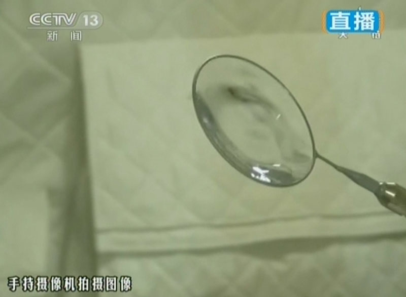 6月20日上午10時許,神舟十號航天員進(jìn)行中國首次太空授課,女航天員王亞平擔(dān)任主講,成為中國首位“太空教師”。圖為王亞平進(jìn)行“水膜”演示。(視頻截圖)