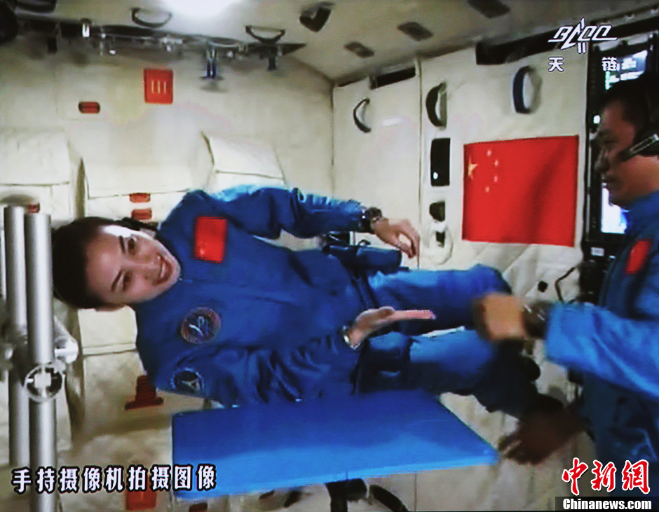 6月20日10時(shí)許,神舟十號(hào)航天員在天宮一號(hào)開展基礎(chǔ)物理實(shí)驗(yàn),為青少年進(jìn)行中國首次太空授課。圖為王亞平講授太空失重提供條件下的方位感演示。中新社發(fā) 秦憲安 攝