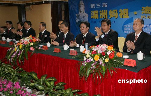 第三屆湄洲媽祖·海峽論壇10月30日在媽祖故鄉(xiāng)福建莆田開幕。全國(guó)政協(xié)副主席張克輝發(fā)來賀信,中國(guó)僑聯(lián)主席林兆樞出席開幕式。來自中國(guó)、菲律賓、日本、澳大利亞、新西蘭、馬來西亞、印尼、新加坡、巴拉圭、南非、荷蘭、臺(tái)灣、香港等13個(gè)國(guó)家和地區(qū)的一百多名僑領(lǐng)以及媽祖文化專家、學(xué)者,將圍繞“媽祖文化與華人華僑”主題進(jìn)行為期兩天的研討交流。出席開幕式的還有福建省政協(xié)副主席、統(tǒng)戰(zhàn)部長(zhǎng)張燮飛等。中新社發(fā) 張勤 攝
