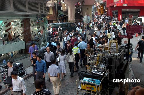 11月9日,好萊塢電影《新蝙蝠俠之黑夜之神》,在香港中環(huán)擺花街取景拍攝,道路兩旁都擺放了拍攝器材。吸引大批市民圍觀。中新社發(fā) 譚達明 攝