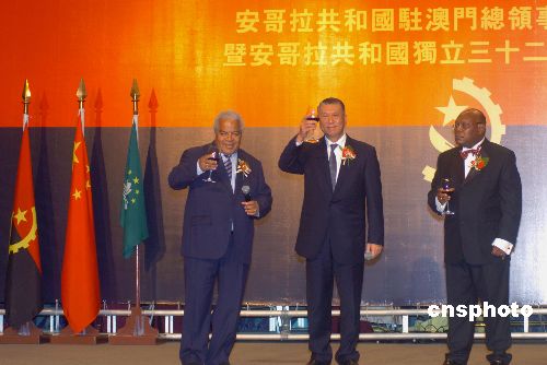 十一月九日晚,安哥拉共和國駐澳門總領事館開幕典禮暨安哥拉獨立三十二周年慶祝酒會在澳門漁人碼頭舉行,澳門特首何厚鏵與安哥拉共和國外交部秘書長Manuel Gomes dos Santos為安哥拉共和國駐澳門總領事館揭幕。 中新社發(fā) 史利 攝