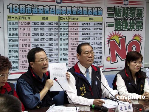 中國國民黨“立法院”黨團十一月十四日表示,支持十八個縣市選舉委員會的決定,希望明年“立委”選舉與“公投”同日舉行時,采“二階段領(lǐng)票,二階段投票”方式,讓選舉順暢單純。圖為國民黨“立委”丁守中出示全臺灣二十五個縣市議會議長的共同聲明,他們表示支持這一投票方式。中新社發(fā) 劉舒凌 攝