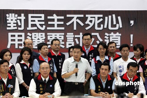 11月16日,高雄市長選舉官司在當(dāng)?shù)囟䦟彾ㄗ。代表中國國民黨的候選人黃俊英(前中)在選舉無效和當(dāng)選無效兩項訴訟中均遭判敗訴。民進(jìn)黨的陳菊在去年12月9日勝出擔(dān)任市長后,今次獲終審保住余下任期。今年6月15日,該官司一審曾判,選舉有效,但陳菊當(dāng)選無效。圖為黃俊英獲知敗訴后,在中國國民黨主席吳伯雄(前左2)和明年大選候選人馬英九(前右2)等陪同下,于競選總部與媒體見面,對選舉結(jié)果表示失望,并希望擔(dān)任義工幫助同黨候選人贏得今后選舉,以討回公道。中新社發(fā) 黃少華 攝
