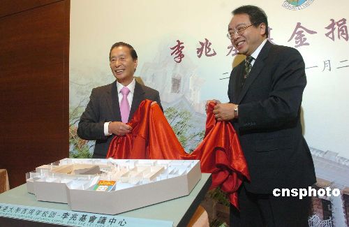 11月22日,香港恒基兆業(yè)地產(chǎn)有限公司主席李兆基博士捐贈五億港元予香港大學(xué),以促進(jìn)港大未來的發(fā)展計(jì)劃,會上李兆基博士(左)與香港大學(xué)校長徐立之教授為“香港大學(xué)百周年校園---李兆基會議中心”模型舉行揭幕儀式,新校園計(jì)劃于2011至2012年落成。中新社發(fā) 鄧慶樂 攝