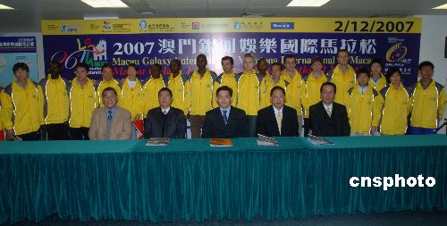 2007澳門銀河娛樂國際馬拉松賽十一月三十日在澳門運動場舉行記者會,本屆比賽將于十二月二日舉行。來自各國各地區(qū)及本澳的兩千七百多選手將參加全程馬拉松、半程馬拉松及迷你馬拉松三個項目的比賽。一年一度的國際馬拉松賽不僅是一項重要的國際體育賽事,已成為澳門市民一項重要的節(jié)慶活動。圖為部分選手在記者會上合影。中新社發(fā) 史利 攝