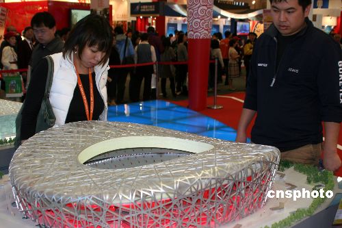 十二月十四日,第二屆海峽兩岸臺(tái)北旅展在臺(tái)北世貿(mào)展館開幕。圖為奧運(yùn)和世博展區(qū)內(nèi)的北京奧運(yùn)會(huì)主場館“鳥巢”模型,吸引觀眾駐足欣賞。中新社發(fā) 董會(huì)峰 攝