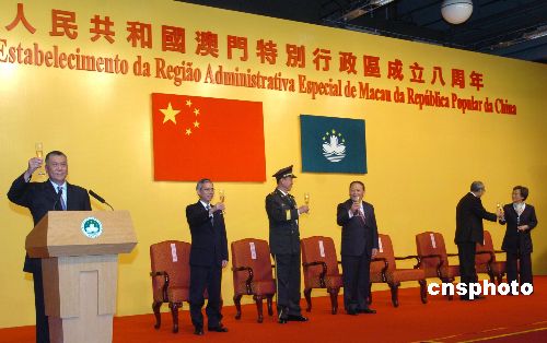 十二月二十日,慶祝澳門特別行政區(qū)成立八周年招待酒會在澳門旅游塔舉行,澳門特首何厚鏵在招待會上致詞,中央人民政府駐澳門聯(lián)絡(luò)辦公室主任白志健等嘉賓出席招待會,賓主舉杯共祝祖國富強(qiáng)繁榮。中新社發(fā) 史利 攝