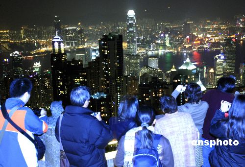 眾多游客和市民在香港太平山頂觀看璀燦夜色,等待時光邁入2008年。中新社發(fā) 王麗南 攝