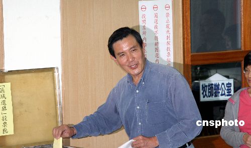 一月十二日是臺灣第七屆“立委”選舉日,當(dāng)天下午,中國國民黨臺灣二00八年“大選”參選人馬英九前往投票場所投票。中新社發(fā) 孫自法 攝