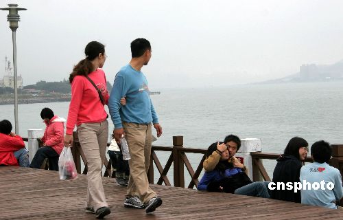 一月二十一日,一對夫婦從臺(tái)北淡水情人橋上走過,不約而同將視線轉(zhuǎn)向橋邊甜蜜相會(huì)的一對對情侶。淡水情人橋位于臺(tái)北淡水河入?诘臐O人碼頭,是觀海、休閑和情侶約會(huì)的好去處。中新社發(fā) 孫自法 攝