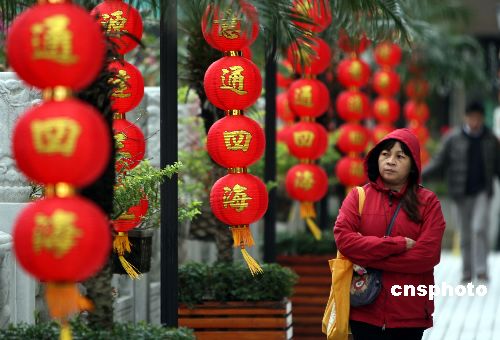 一月三十一日,一位香港市民走過街頭大紅的新春裝飾。當(dāng)日,香港天文臺表示,今早錄得的最低氣溫為八點(diǎn)五度,是入冬以來的最低紀(jì)錄。中新社發(fā) 武仲林 攝