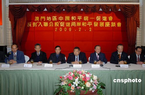 二月二日,澳門地區(qū)中國和平統(tǒng)一促進會在萬豪軒酒店舉行“反對‘入聯(lián)公投’,促進兩岸和平發(fā)展”座談會。專程來澳門的臺灣新黨主席郁慕明主講了“兩岸關(guān)系發(fā)展的形式和前景”,與會各界人士也紛紛表達了反對“入聯(lián)公投”,促進兩岸和平發(fā)展的心聲。中新社發(fā) 史利 攝
