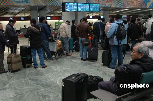 二月三日,澳門國際機場辦理登機手續(xù)處排起了長隊。春節(jié)期間,澳門航空公司加開三十四個航班,分別為杭州兩班,上海十二班,臺北八班和東京包機十二班,以滿足市場需求。中新社發(fā) 史利 攝