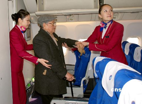 圖為兩位乘務員細心攙扶著八旬臺胞入座。
