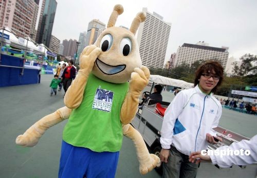香港渣打馬拉松將在周日舉行,十六日,組委會(huì)在維多利亞公園舉行“為地球而跑—環(huán)保祝賀行動(dòng)”,呼吁推動(dòng)環(huán)保。圖為吉祥物穿梭會(huì)場(chǎng)宣傳助興。中新社發(fā) 洪少葵 攝