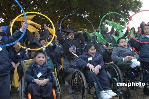 二月二十日是北京零八傷殘奧運會倒數(shù)二百天,香港不少特殊學校學生參加在彭福公園舉行的“北京二零零八年殘奧會二百天倒數(shù)“儀式。中新社發(fā) 譚達明 攝
