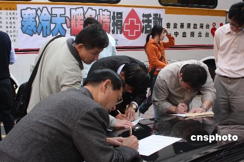 春節(jié)前后,臺(tái)灣持續(xù)降溫、降雨,天氣冷颼颼,民眾減少出門(mén),學(xué)生亦放寒假,臺(tái)灣各地捐血中心血庫(kù)都鬧血荒,安全庫(kù)存量應(yīng)該要有一個(gè)星期,但血庫(kù)大多只有正常庫(kù)存量的四分之一。二月二十一日,中國(guó)國(guó)民黨發(fā)起捐血活動(dòng),希望緩解血荒。中新社發(fā) 耿軍 攝