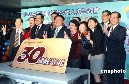 臺北市捷運運量累計突破三十億人次。圖為三日下午臺北捷運臺北車站內,臺北市前任市長馬英九、現(xiàn)任市長郝龍斌等參加慶祝記者會。中新社發(fā) 曾嘉 攝