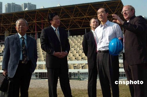 三月四日下午,香港署理行政長官唐英年(右二)與多名局長、警務處長,連同北京奧組委官員參觀由沙田香港體育學院改建而成的奧運及殘奧馬術主要比賽場地和相關配套工程。中新社發(fā) 譚達明 攝