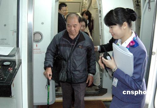 四月二日中午,臺灣復興航空公司兩岸清明包機抵達廈門機場,揭開本次兩岸清明包機廈門航點序幕。圖為服務人員精心照料年歲較大的臺胞乘客。中新社發(fā) 陳悅 攝