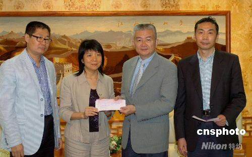 五月十三日,澳門中聯(lián)辦副主任徐澤(右二)接受盧德華女士(左二)交來的二十五萬元港幣善款。這是五位澳門四川省政協(xié)委員捐助,用于救助四川地震災民的善款。中新社發(fā) 史利 攝