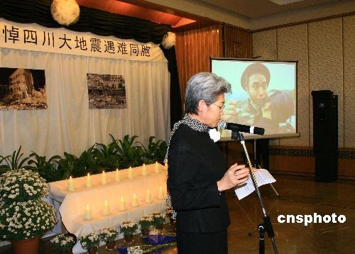 當?shù)貢r間19日下午2時28分,旅英華人華僑、中資機構(gòu)和留學(xué)生代表在中國使館內(nèi),和中國外交官一起默哀三分鐘,沉痛悼念在四川大地震中遇難的同胞。圖為傅瑩大使在哽咽著致悼詞。