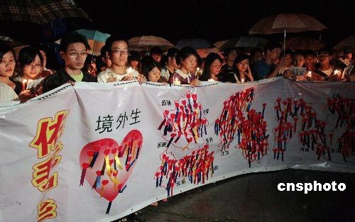 5月19日中國全國哀悼日,福建華僑大學(xué)學(xué)子點起蠟燭,齊唱《讓世界充滿愛》為四川地震受難者祈禱。圖為在校境外學(xué)生手拉條幅,為逝者哀悼、為生者加油。中新社發(fā) 傅丹丹 攝