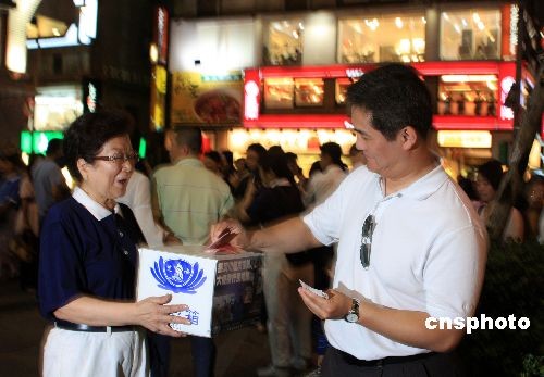 五月二十日晚,一名臺灣民眾在街頭見到為四川賑災募捐的慈濟義工,毫不遲疑掏出一把鈔票塞入募捐箱。