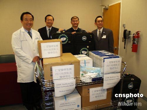 5月23日,由美國人醫(yī)會、仁愛醫(yī)療集團和嘉惠爾醫(yī)院10名華裔醫(yī)師組成的醫(yī)療賑災小組飛往四川災區(qū)參加救援,包括骨科醫(yī)師林元清、精神科醫(yī)師王炘、腦神經(jīng)科醫(yī)師林宗義、許明彰、外科醫(yī)師陳福民等。救援小組初步計劃在災區(qū)停留10天。圖為林元清等華裔醫(yī)師攜帶50箱藥物器具前往四川災區(qū)。 中新社發(fā) 盧威 攝