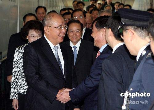 圖為吳伯雄在機場與香港中聯(lián)辦臺灣事務(wù)部部長邢魁山握手。