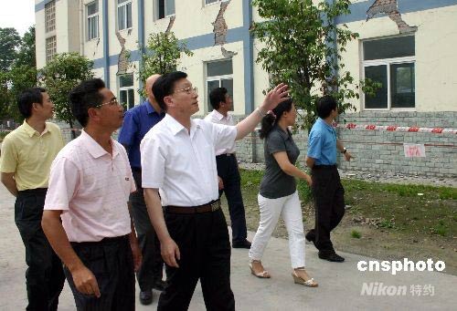 5月31日,國務(wù)院僑辦副主任馬儒沛一行來到四川省彭州市察看該市通濟(jì)中學(xué)在地震中受損情況。圖為馬儒沛在聽取通濟(jì)中學(xué)校長(zhǎng)唐保良的介紹。中新社發(fā) 伊西科 攝