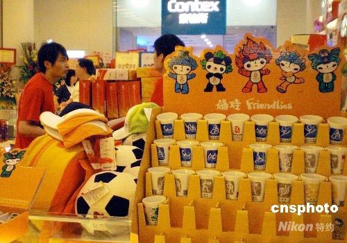 距離北京奧運開幕日子越來越近,香港一些商場銷售奧運紀念品的專柜生意紅火。 中新社發(fā) 洪少葵 攝