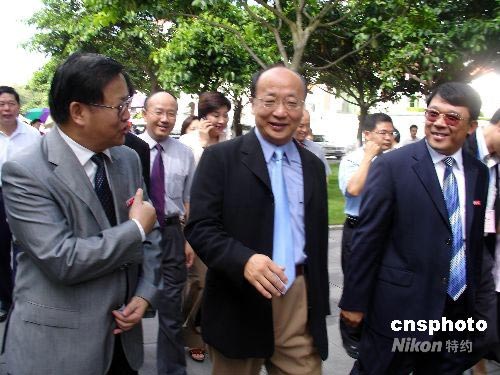 七月五日上午,臺(tái)中市市長胡志強(qiáng)(中)到廈門大學(xué)參訪。圖為廈門大學(xué)黨委書記朱之文(右)、廈大校長朱崇實(shí)(左)陪同他參觀校園。中新社發(fā) 楊伏山 攝