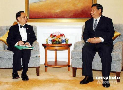 七月六日,中國(guó)國(guó)家副主席習(xí)近平在香港會(huì)見(jiàn)特區(qū)行政長(zhǎng)官曾蔭權(quán)。中新社發(fā) 新聞處 攝
