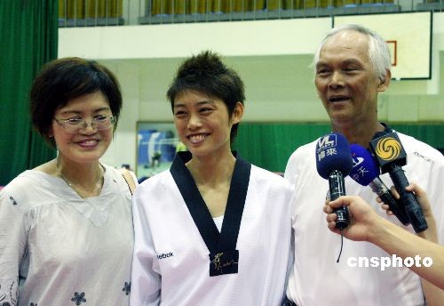 中華臺北隊(duì)選手們目前正在高雄左營訓(xùn)練中心加緊訓(xùn)練,準(zhǔn)備以最好的狀態(tài),備戰(zhàn)北京奧運(yùn)。圖為跆拳道隊(duì)員蘇麗文(中)與父母接受媒體采訪。其父母表示屆時(shí)將赴北京,到現(xiàn)場為女兒加油。中新社發(fā) 黃少華 攝