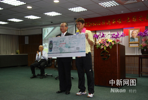 臺灣土地銀行27日舉行歡迎在北京奧運會上打進(jìn)羽毛球男單八強(qiáng),并列第五名的中華臺北隊隊員謝裕興返臺表揚會。謝裕興大學(xué)三年級時加入土地銀行羽毛球隊。圖為臺灣土地銀行董事長吳繁治向謝裕興(右一)頒發(fā)獎金,以資鼓勵。作者 陳立宇