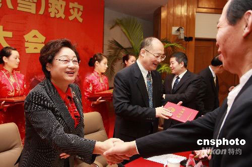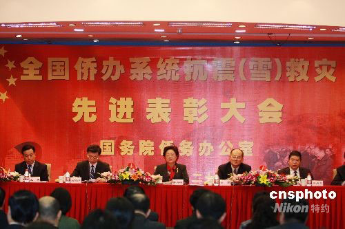 9月28日,國務(wù)院僑辦在北京召開僑辦系統(tǒng)抗震(雪)救災(zāi)先進(jìn)表彰電視電話會議,對全國僑辦系統(tǒng)在抗震(雪)救災(zāi)斗爭中表現(xiàn)突出的50個先進(jìn)集體和100名先進(jìn)個人予以表彰。中新社發(fā) 鄭雄增 攝