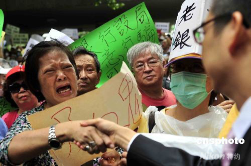 十月八日,過(guò)百名受雷曼迷你債券事件影響的香港市民,在香港立法會(huì)前請(qǐng)?jiān)。圖為民建聯(lián)立法會(huì)議員劉江華(右)與請(qǐng)?jiān)刚邥?huì)面。中新社發(fā) 譚達(dá)明 攝