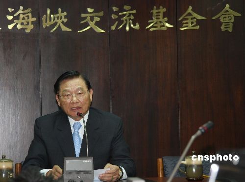 10月21日中午,臺(tái)灣;鶗(huì)董事長(zhǎng)江丙坤召開臨時(shí)記者會(huì),譴責(zé)暴力襲擊來(lái)臺(tái)灣進(jìn)行學(xué)術(shù)訪問(wèn)的海協(xié)會(huì)副會(huì)長(zhǎng)、廈門大學(xué)傳播學(xué)院院長(zhǎng)張銘清。中新社發(fā) 耿軍 攝