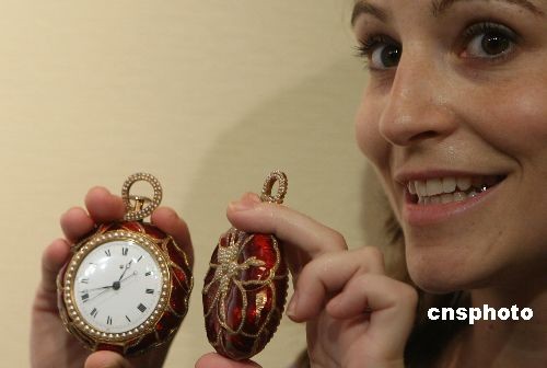 十月二十三日,佳士得在香港舉行記者會(huì),展示十二月三日名表拍賣會(huì)上的精品。圖為模特展示一款由英國皇室贈(zèng)送給中國乾隆皇帝的石榴形懷表,估價(jià)一百二十萬至二百萬港元。中新社發(fā) 武仲林 攝