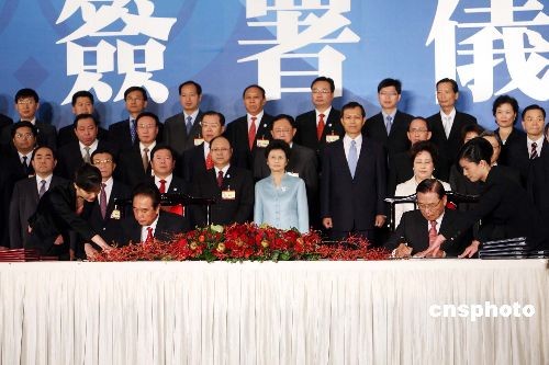 十一月四日,海協(xié)會(huì)與;鶗(huì)在臺(tái)北圓山飯店舉行歷史性的會(huì)談后,大陸海協(xié)會(huì)會(huì)長(zhǎng)陳云林與臺(tái)灣;鶗(huì)董事長(zhǎng)江丙坤下午十四時(shí)許在臺(tái)北就兩岸海運(yùn)、空運(yùn)、郵政、食品安全等議題簽署四項(xiàng)協(xié)議。中新社發(fā) 洪少葵 攝