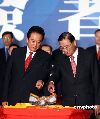 十一月四日,海協(xié)會(huì)與;鶗(huì)在臺(tái)北圓山飯店舉行歷史性的會(huì)談后,兩會(huì)領(lǐng)導(dǎo)人陳云林與江丙坤下午兩點(diǎn)舉行兩會(huì)簽署協(xié)議儀式,簽署包括空運(yùn)、海運(yùn)直航、通郵,以及食品安全等四項(xiàng)協(xié)議。圖為簽署協(xié)議后陳云林贈(zèng)送江丙坤一尊握手形象的雕塑。中新社發(fā) 洪少葵 攝