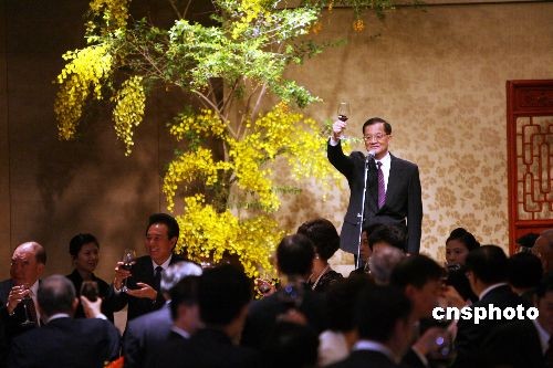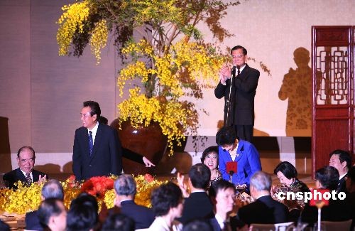 十一月四日晚,國(guó)民黨榮譽(yù)主席連戰(zhàn)、連方瑀伉儷在臺(tái)北國(guó)賓飯店設(shè)宴款待陳云林訪問(wèn)團(tuán)一行。中新社發(fā) 洪少葵 攝