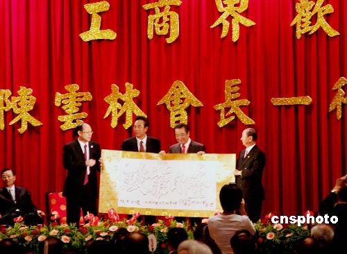 圖為陳云林代表海協(xié)會致贈以撰寫“駿業(yè)日隆”四大字的書法作品,祝福臺灣工商界生意興隆。