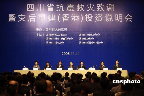 十一月十一日,四川省抗震救災(zāi)致謝暨災(zāi)后重建(香港)投資說明會(huì)在香港華潤大廈舉行,全國政協(xié)副主席董建華、香港中聯(lián)辦主任高祀仁、四川省委書記劉奇葆、香港政務(wù)司司長唐英年等出席。中新社發(fā) 武仲林 攝